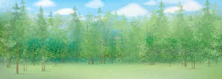 Panoramic view of the forest from coniferous trees hand drawn vector illustration sketch design. PREMIUM